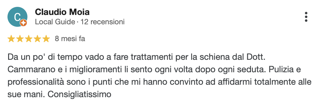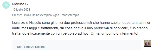 Pubblicato suTrustindex verifica che la fonte originale della recensione sia Google. SONO STATO QUESTA MATTINA DA LORO E MI HA SEGUITO IL DOT LORENZO ...CHE DIRE UNA PERSONA MOLTO COMPETENTE LO CONSIGLIO PERCHE RIESCE A TRASMETTERE UNA FORTE EMPATIA SPIEGANDO IL TUTTO FACENDO IN MODO CHE IL PAZIENTE CAPISCE ....domenico patruno Pubblicato suTrustindex verifica che la fonte originale della recensione sia Google. Esperienza positiva! Roberto è stato perfetto, e mi sono trovata benissimo! Lo consiglioMaria Sole Ferrero Pubblicato suTrustindex verifica che la fonte originale della recensione sia Google. Ragazzi bravissimi, fanno quasi miracoli!!Flavia Mauro Pubblicato suTrustindex verifica che la fonte originale della recensione sia Google. Esperienza assolutamente positiva, il Dott. Lorenzo in 3 sedute mi ha risolto un problema che mi trascinavo da anni con professionalità ed empatia ed estrema disponibilità. La sua accuratezza nel fare domande specifiche per comprendere i sintomi e le spiegazioni relative, mi hanno confermato la professionalità e la serietà nel seguire il paziente, con determinazione nel risolvere la problematica. Consiglio vivamente!Lucia Lomartire Pubblicato suTrustindex verifica che la fonte originale della recensione sia Google. Bravi,competenti,pazienti.. Grazie. Certamente al bisogno torneròlorenzo prandi Pubblicato suTrustindex verifica che la fonte originale della recensione sia Google. dopo un terribile incidente in scooter grazie a loro sono riuscito a riprendermi la mia mobilità dopo quattro lunghi mesivincenzo FRANCO Pubblicato suTrustindex verifica che la fonte originale della recensione sia Google. molto competenti e cordiali, consiglio!gabriele maestri Pubblicato suTrustindex verifica che la fonte originale della recensione sia Google. Molto preparati e competenti, disponibili a tenere conto delle esigenze del paziente nello stabilire gli appuntamenti, che non sono mai in numero superiore alle reali necessità.Giacomo Rosa Pubblicato suTrustindex verifica che la fonte originale della recensione sia Google. Posso assegnare 5 stelle ma questi professionisti ne meritano molte di più. Presenza empatia accoglienza sensibilità competenza e velocità nell'individuare il problema è risolverlo in poco tempo. Presenza anche nel post terapie.... È non è poco. Che dire.... Perle rare e preziose..... CONSIGLIATISSIMO.maria colitto Pubblicato suTrustindex verifica che la fonte originale della recensione sia Google. Professionali, empatici e molto preparati. Davvero straconsiglio. È stata una bella scoperta. Grazie ragazzi!A Sette